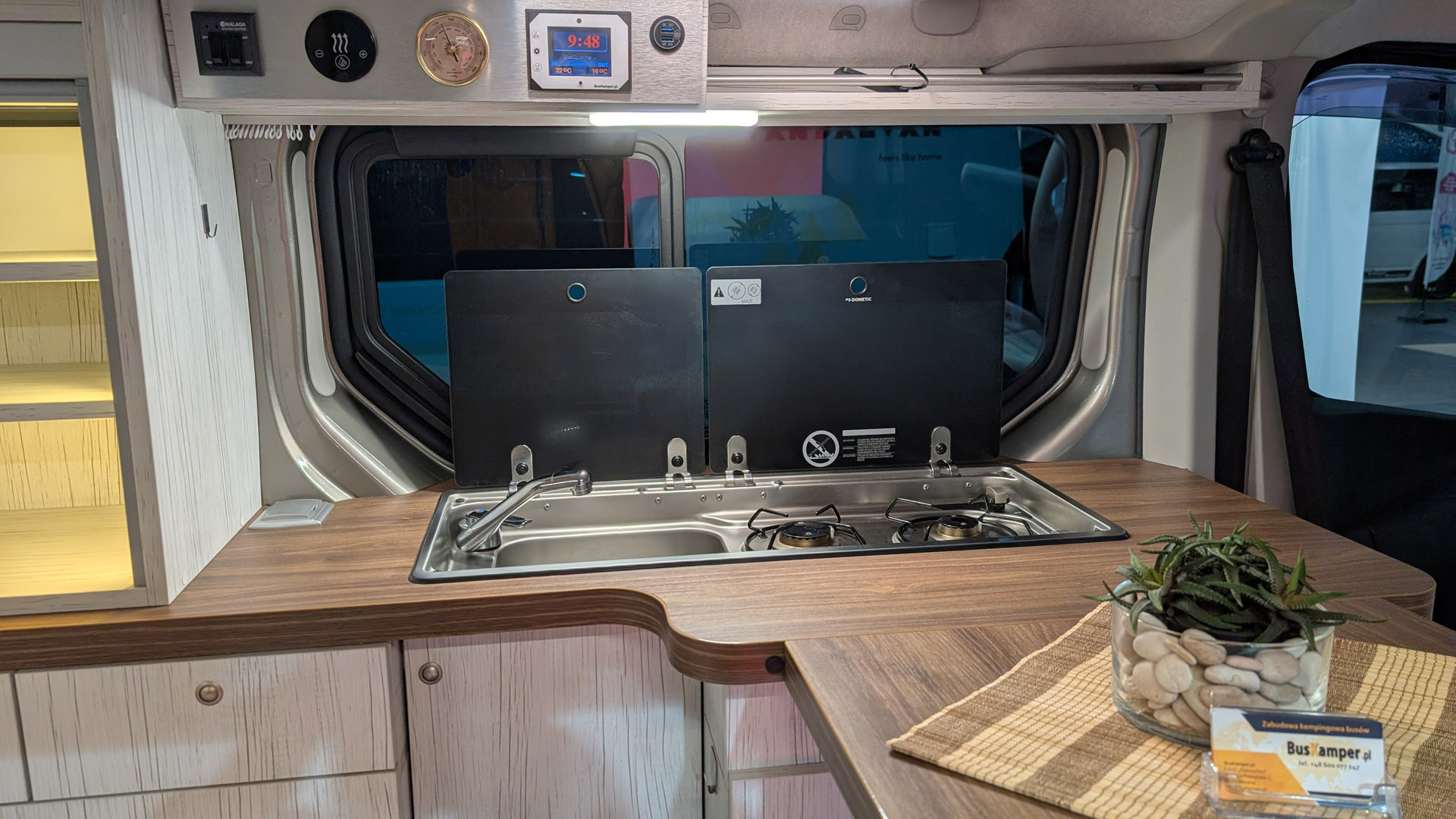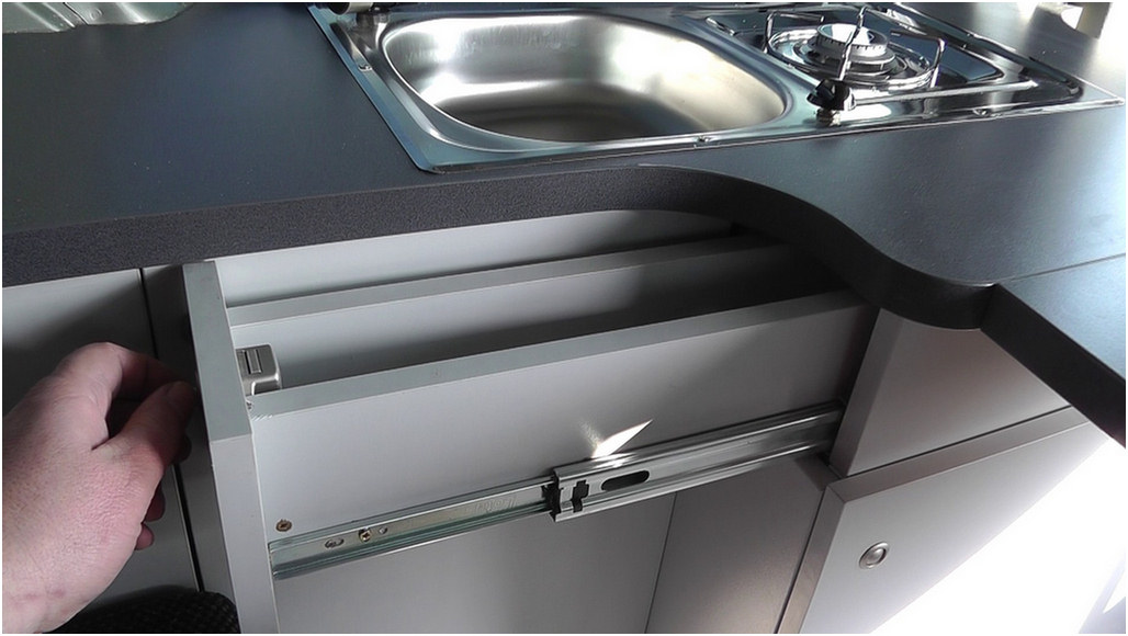 - Nierdzewna kuchenka gazowa z zlewozmywakiem ,zapalaczem i układem odcinania gazu, kranem, pompką oraz zbiornikami na czystą i szarą wodę (20l).