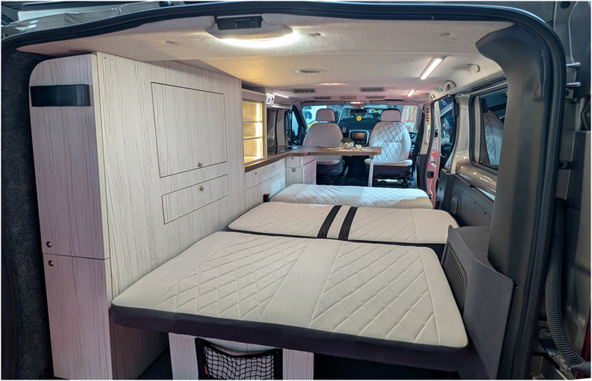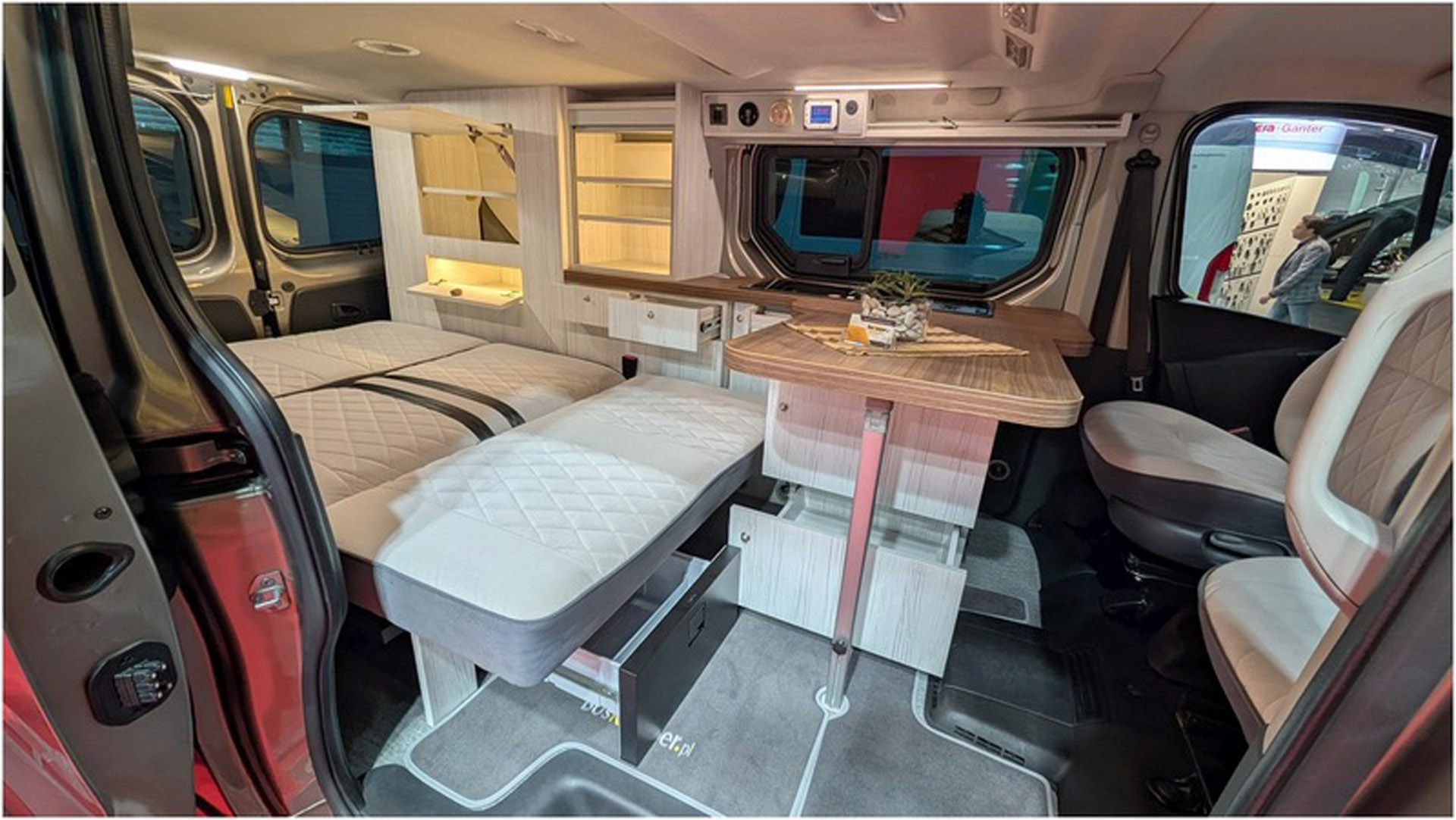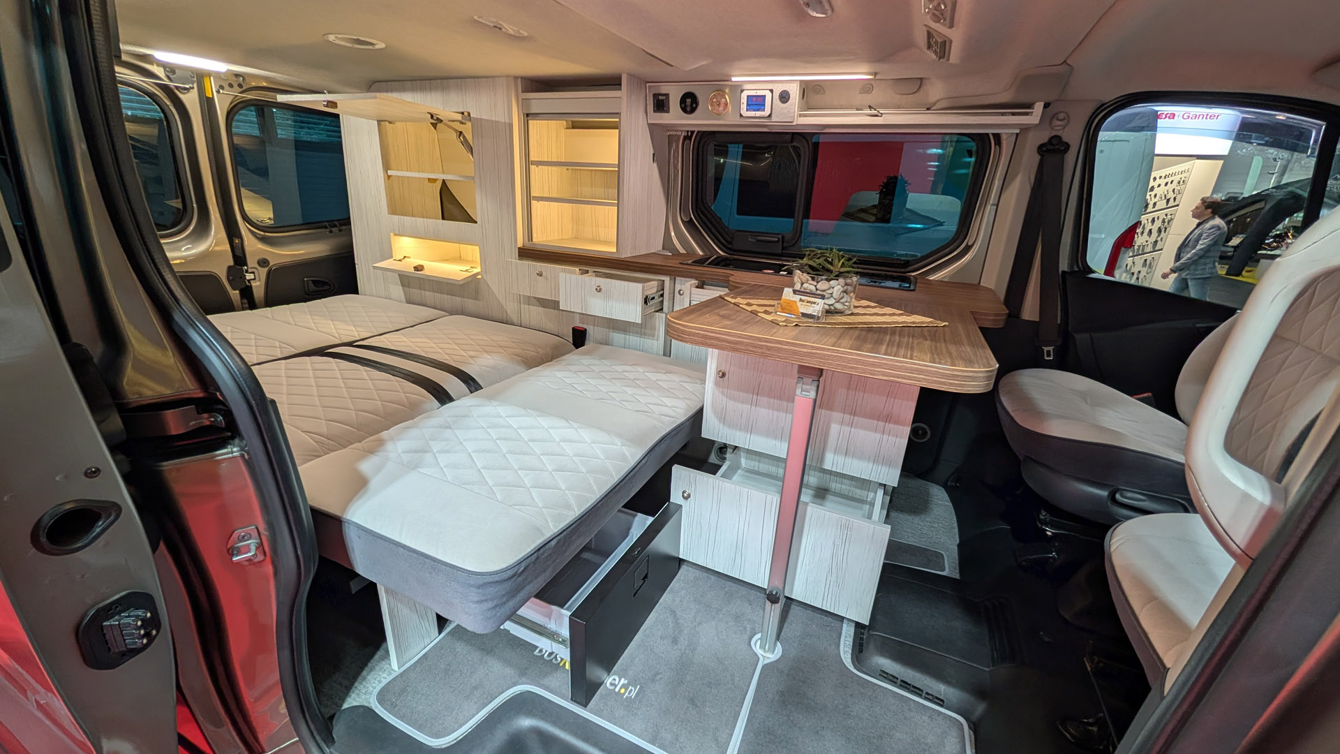 - Kanapa na stalowym, mocnym stelażu, mocowana do oryginalnych miejsc, które przewiduje konstrukcja samochodu. Rozkłada się ją jednym ruchem na wygodne łóżko o wymiarach 125 x 195 cm. Rozłożenie łóżka nie wymaga składania stołu. Można nadal przy nim siedzieć. Pod całym łóżkiem znajduje się duża przestrzeń przeznaczona na bagaż. Z lewej strony, wzdłuż, aż do linii lodówki (~195cm) znajduje się specjalna wnęka do przewożenia nart, wędek, kijów do golfa itp. Rodzaj i kolor tapicerki auta do wyboru wg. wzornika podczas zamawiania.