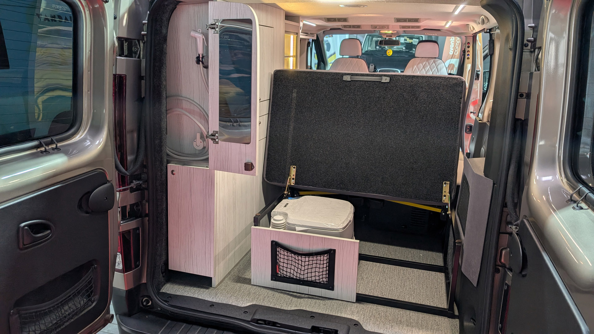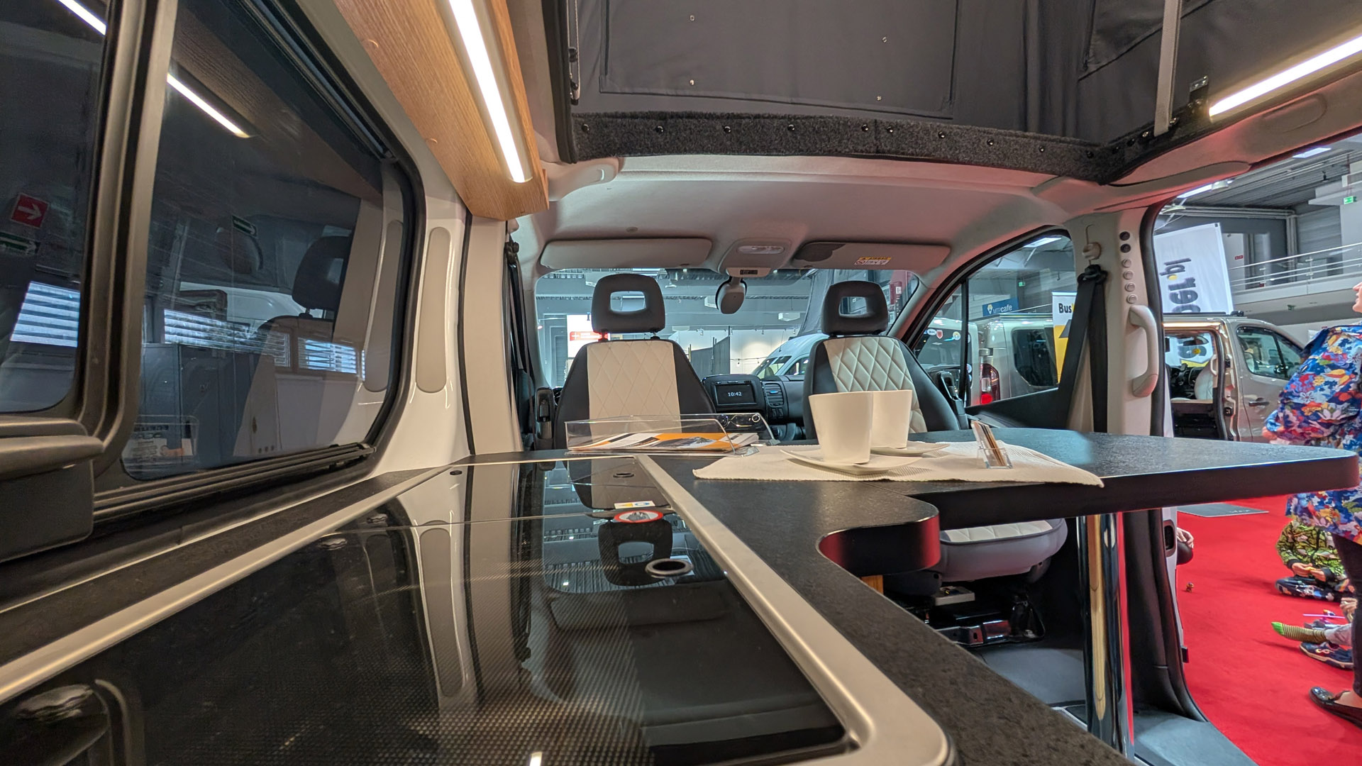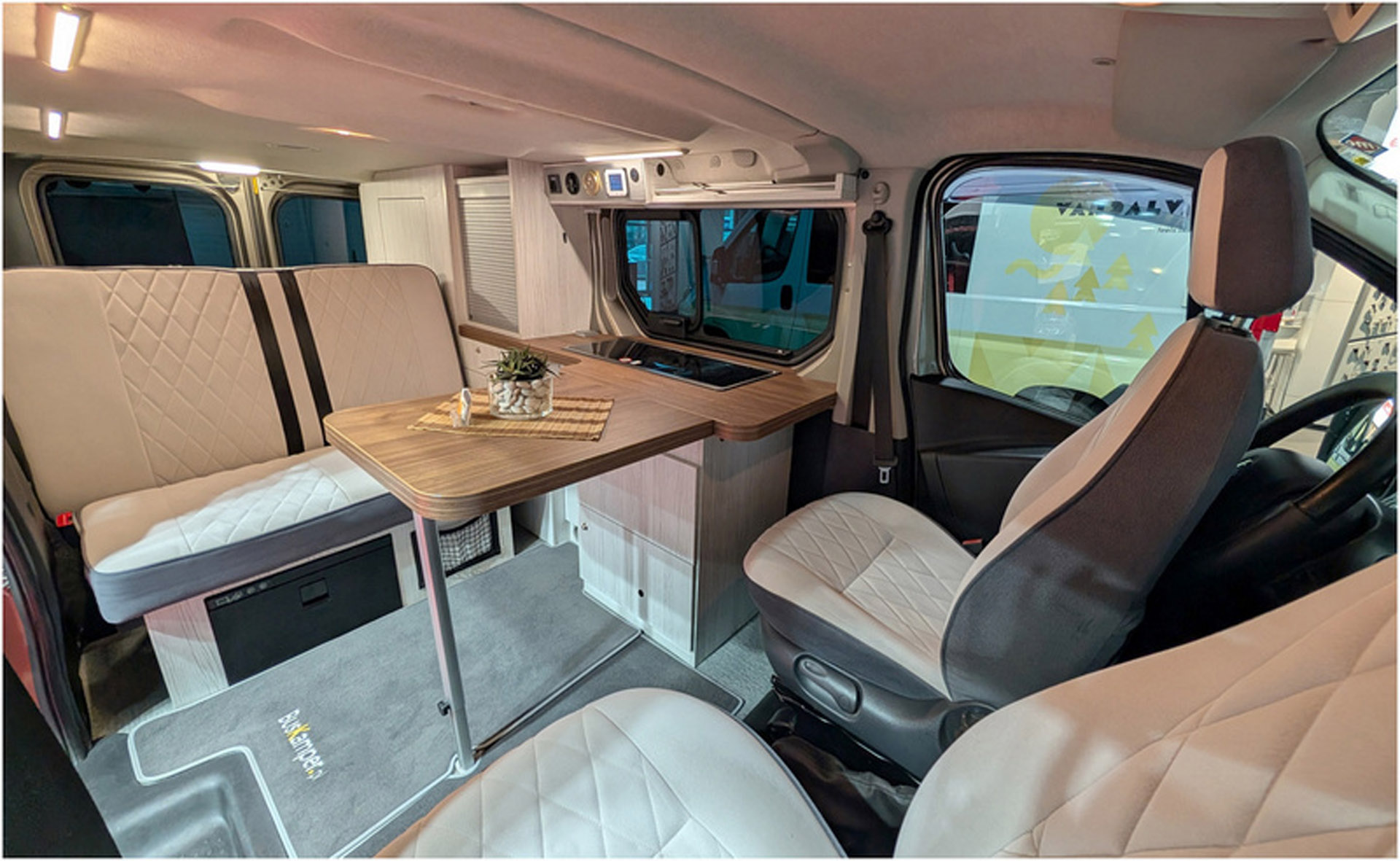 - Kanapa na stalowym, mocnym stelażu, mocowana do oryginalnych miejsc, które przewiduje konstrukcja samochodu. Rozkłada się ją jednym ruchem na wygodne łóżko o wymiarach 125 x 195 cm. Rozłożenie łóżka nie wymaga składania stołu. Można nadal przy nim siedzieć. Pod całym łóżkiem znajduje się duża przestrzeń przeznaczona na bagaż. Z lewej strony, wzdłuż, aż do linii lodówki (~195cm) znajduje się specjalna wnęka do przewożenia nart, wędek, kijów do golfa itp. Rodzaj i kolor tapicerki auta do wyboru wg. wzornika podczas zamawiania.